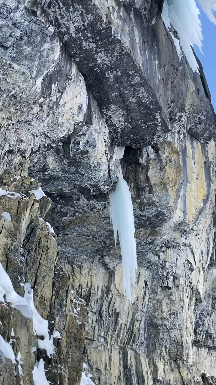 The cave is just so cool that I have to describe it twice. You climb a hanging dagger up into it, then hook icicles, solution pockets, and huge jugs as you chimney upward and get a no hands rest. There is a great bucket of a pocket as you pull outward, and I hooked it, then cut 3 points and swung through the squeeze. An improbable floating undercling leads up from there, and eventually I was able to stem out on the dagger as I finished working my way upward to the belay.
