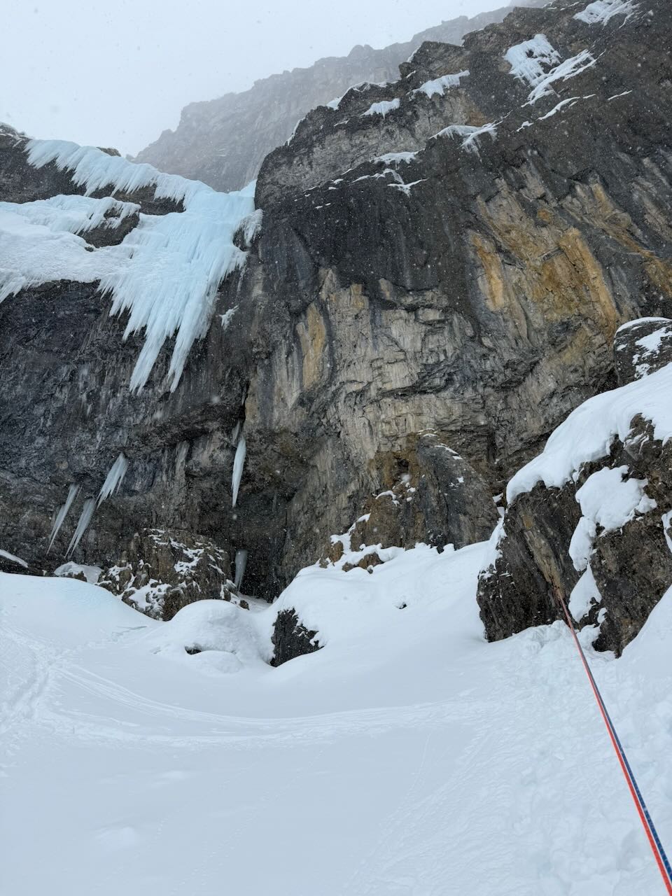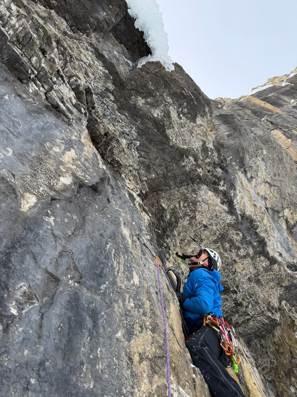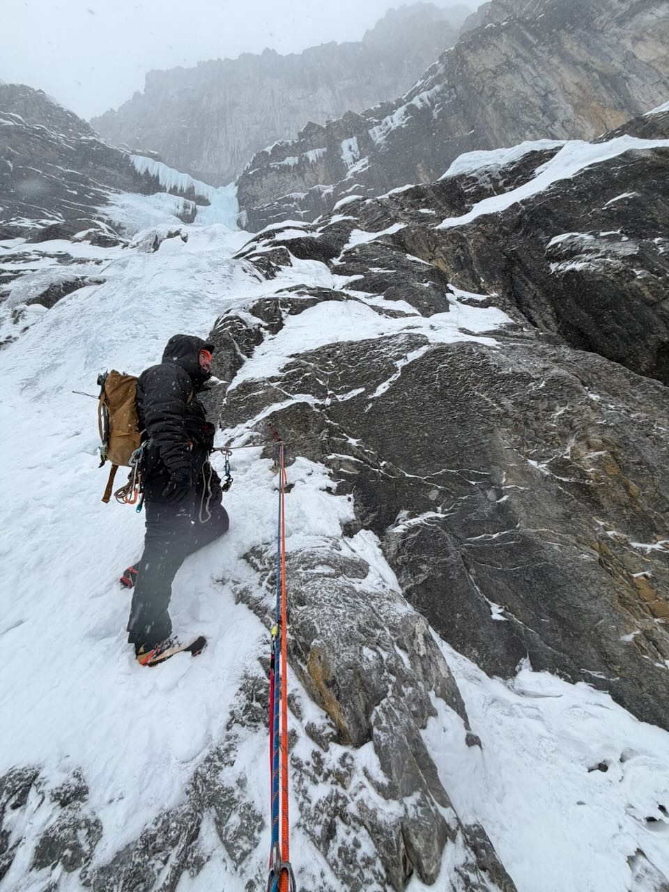 Raph loves good style, and good style to him means everyone sending the crux on lead. I lowered off to the snow ledge so he could take a crack on the sharp end. As is often the case, he made it look like an easy and enjoyable affair. I followed, cleaning the pitch, and then took off up the ice.