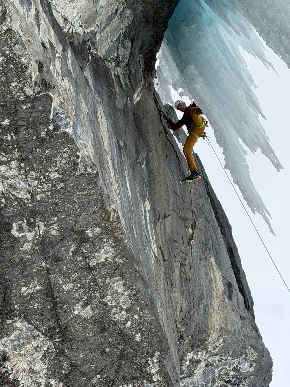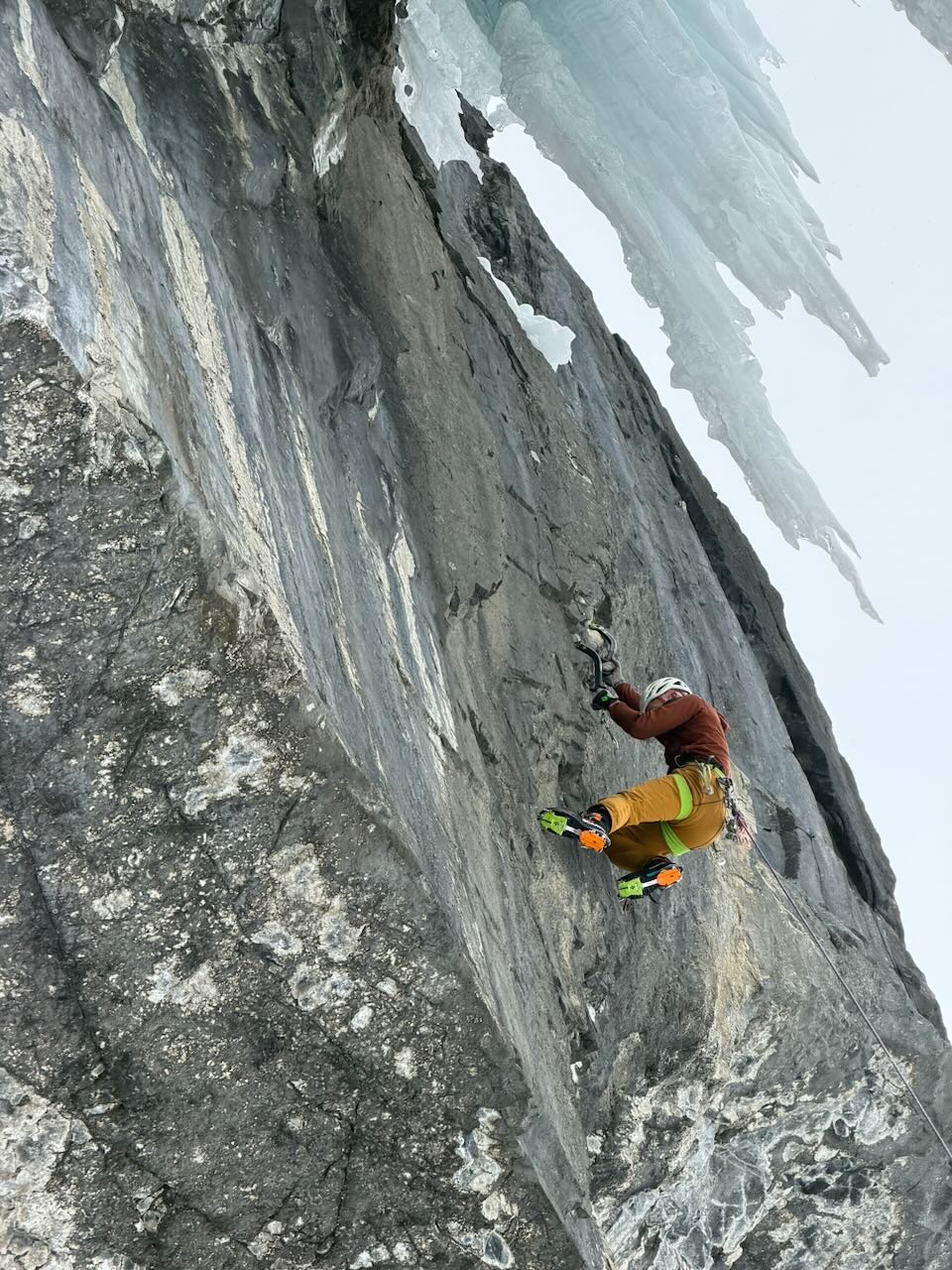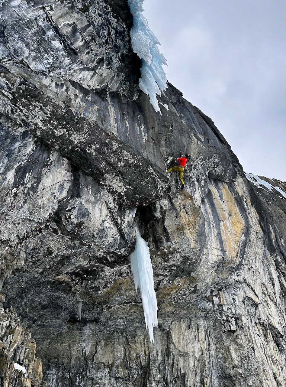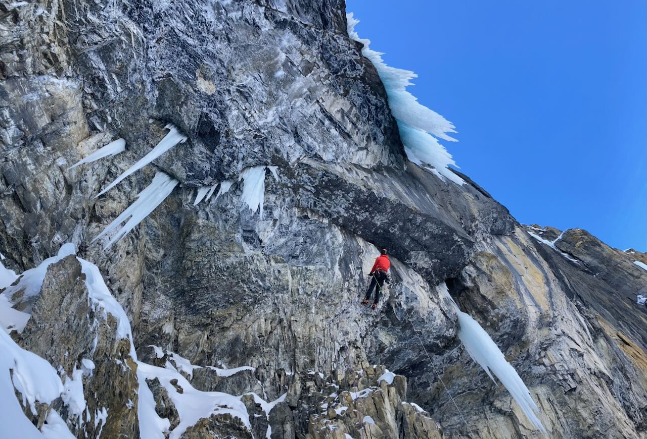 On my first day up there, Matt and I brought a drill to retrofit some single bolt anchors. Right away, an opportunity presented itself. While pitch one didn’t come down low enough to climb as a pure ice line, it did come down much further than it had when Raph Slawinski put up Stairs and Flowers. I headed up the first couple bolts of S&F with the drill, and added a two bolt variation that let us gain the ice more directly. I offered Matt the first crack and he dug deep to get it done. It’s a short sequence, but it packs a punch.