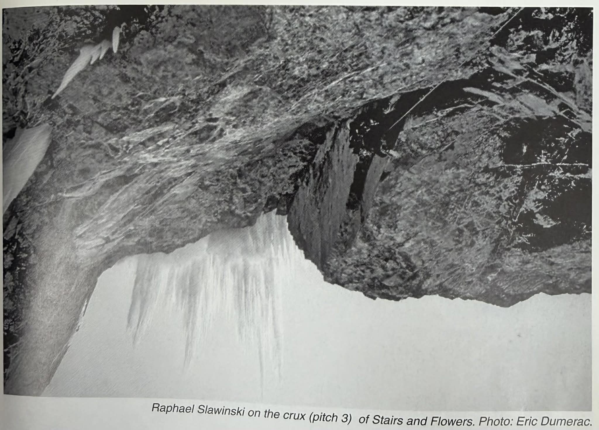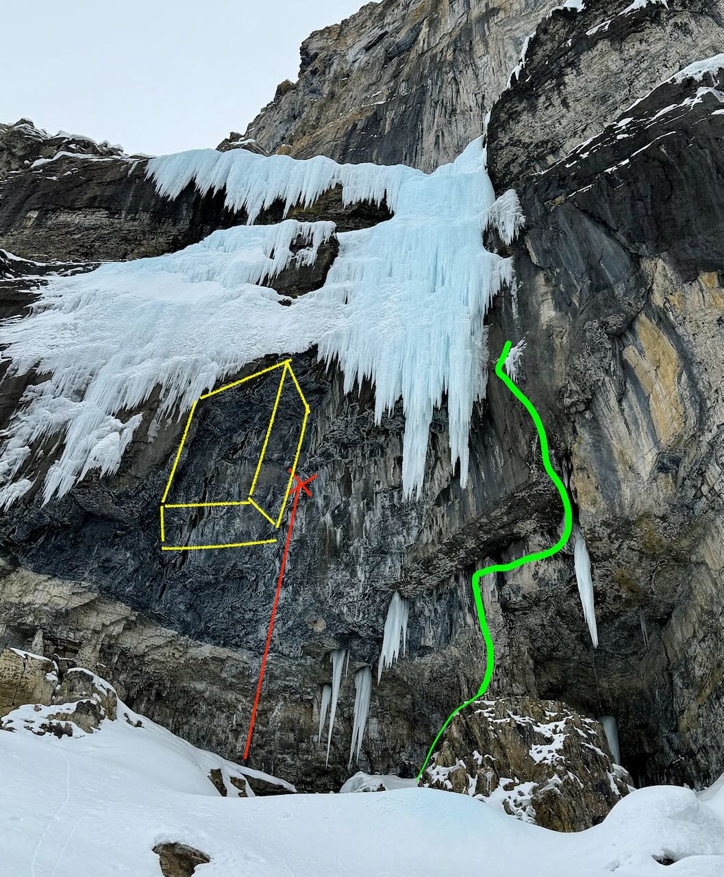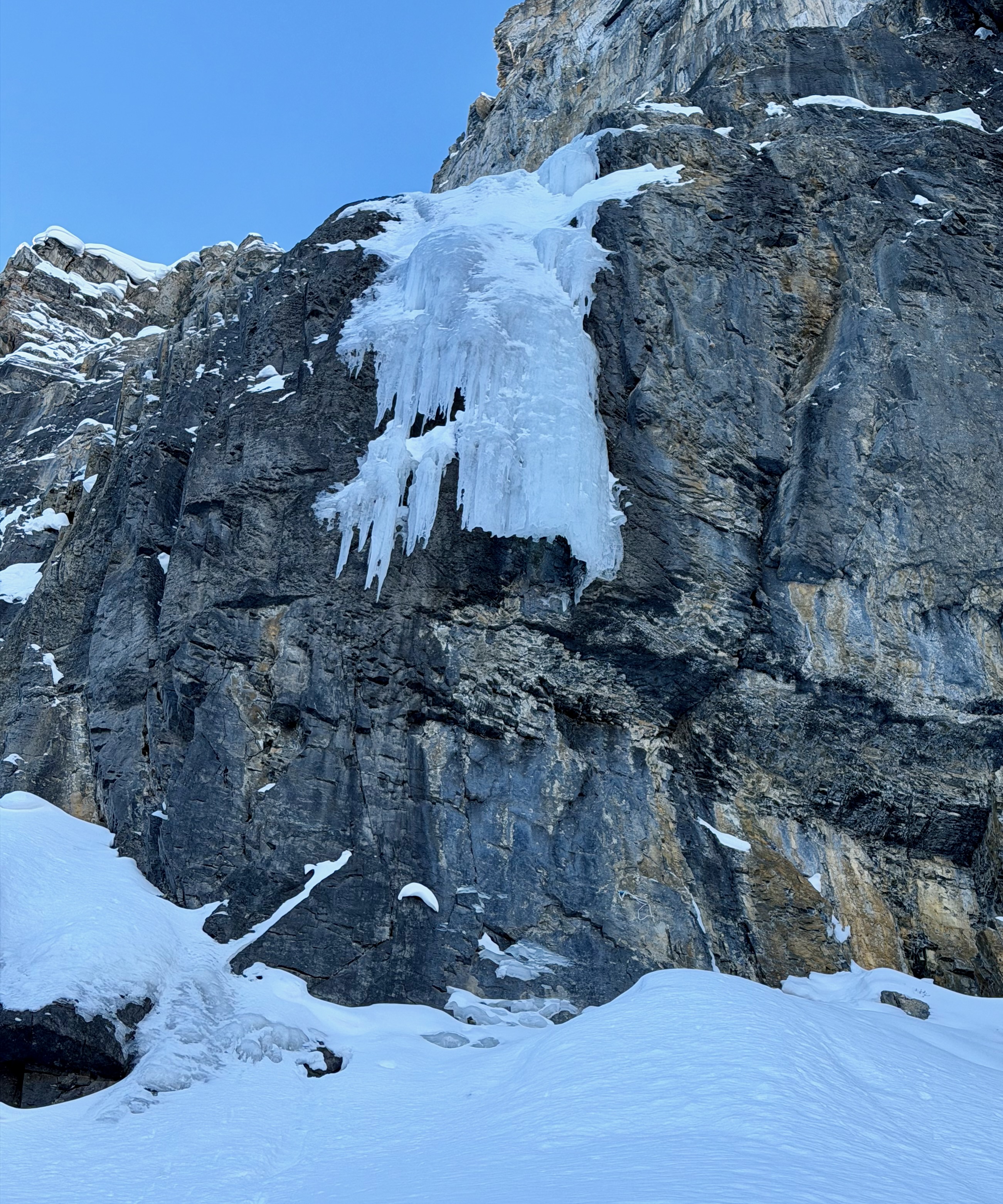 My eyes wandered around the cliff, eventually piecing together a concept of a line that would climb through an overhanging cave with a tongue of ice pouring out.