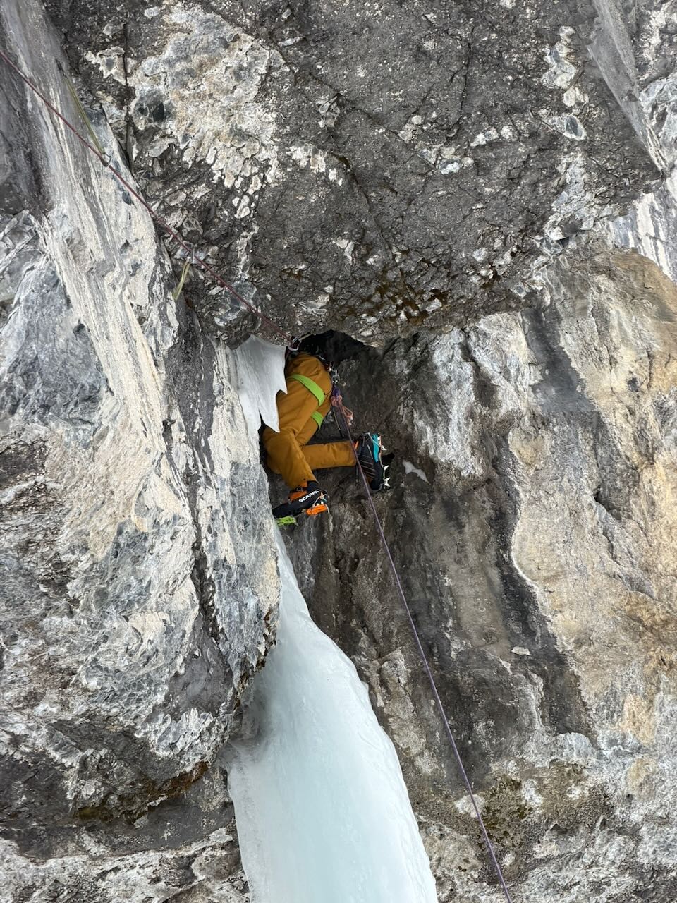 Selecting some bolt locations was tricky, especially factoring in the somewhat contrived wanderings of the path of least resistance. But the allure of the cave called, and upon arrival, it did not disappoint. It was full of ice formations and solution pockets to climb and chimney amongst. The exit proved delightful, a squeeze sequence where you hook a jug past the roof from a knee bar, then cut feet and swing out into a highly exposed stance. Pretty unique, especially on a mixed pitch.