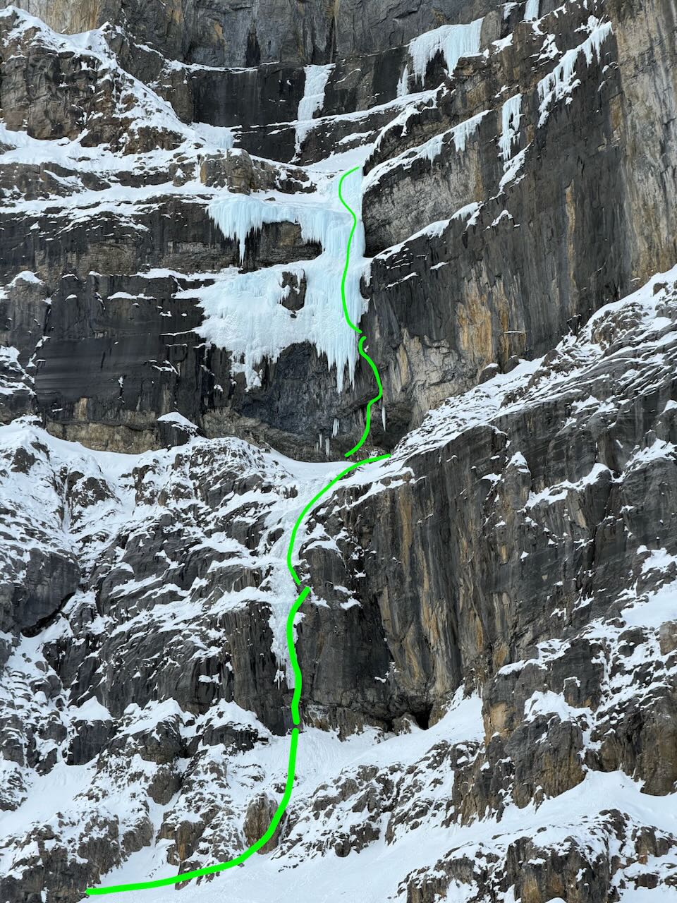 If the ice is low enough, climb past two bolts directly above the anchor. Branch up and left past two more bolts, pulling a short but powerful roof. Continue up a section of steep ice, followed by another stretch of easier ice to the same anchor.