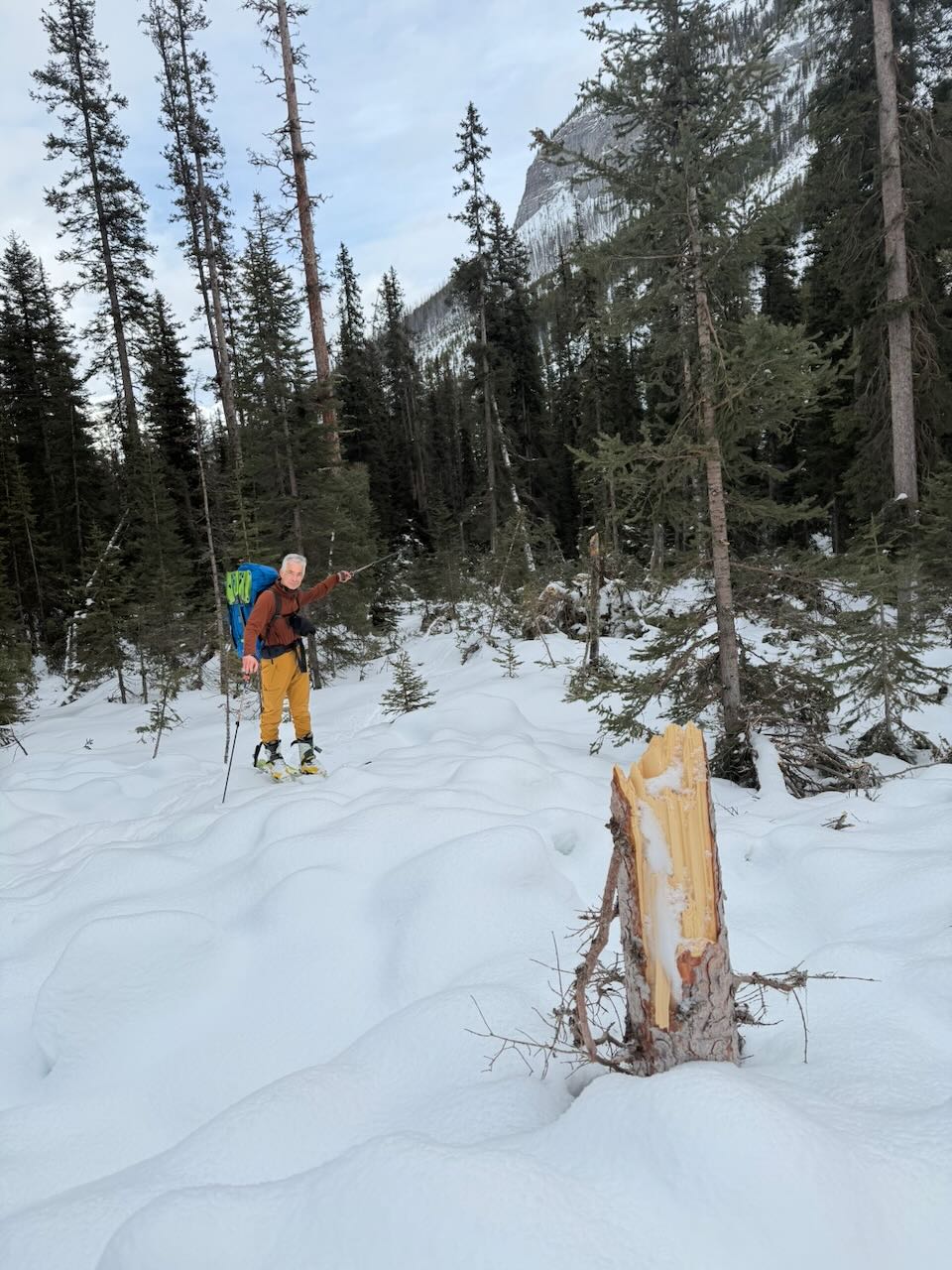 The avalanche cycle had been epic. Right where we broke out of the trees, it had run record lengths and knocked out mature timber. It was actually a great reset for the approach slope, which had basically been swept to dirt and littered with debris. We booted up to the route.