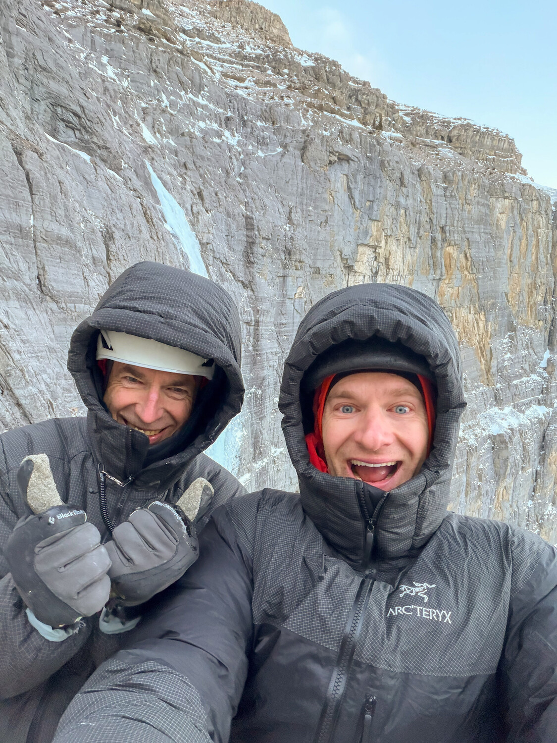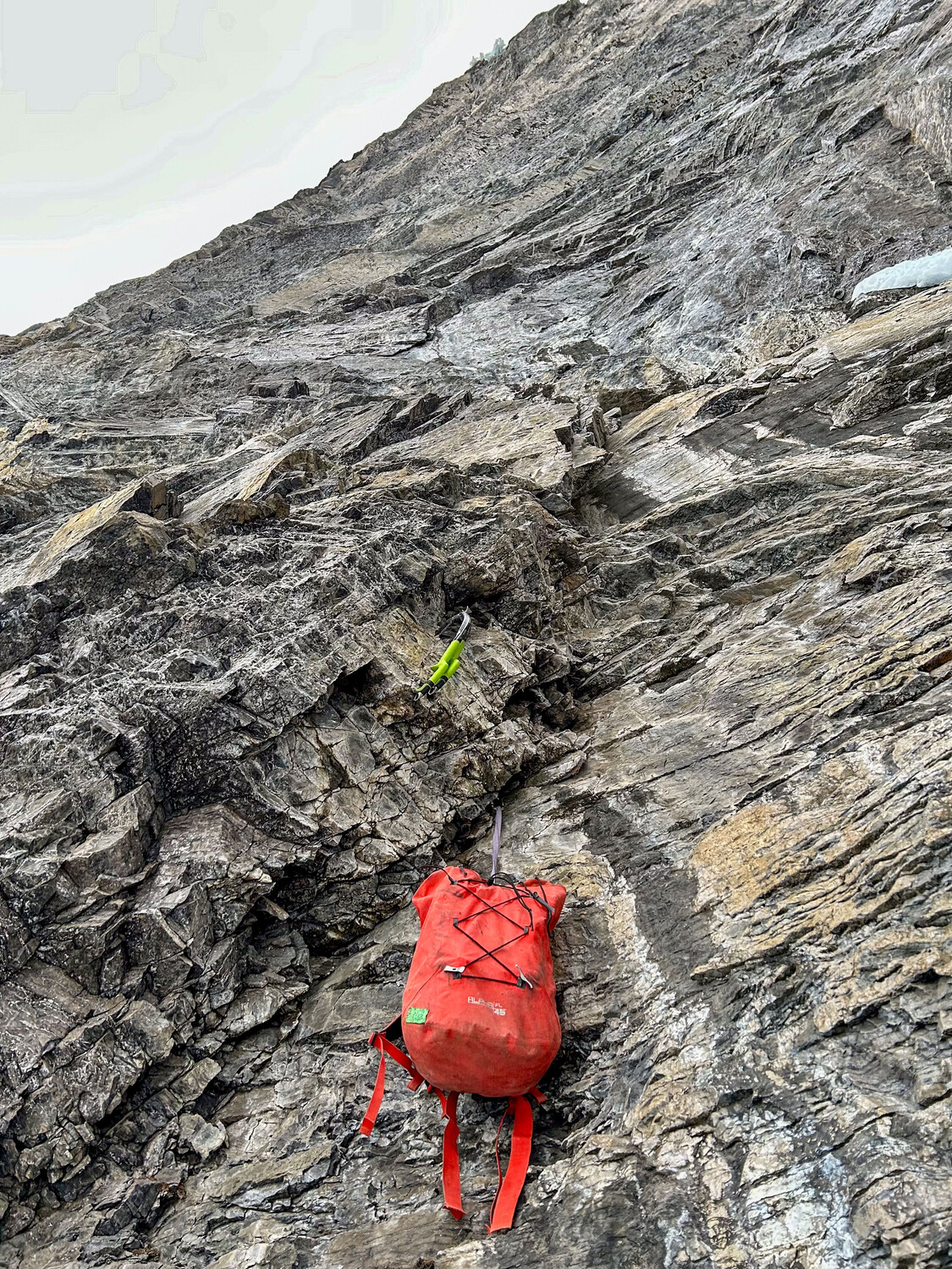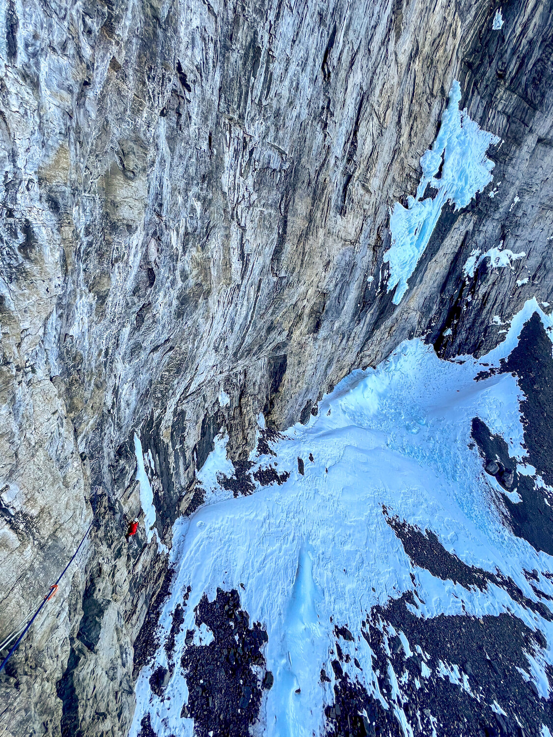 It was my turn. I was exhausted from the previous days, and had figured I would just hang-dog and measure some draws for later replacement with fixed chains. But Raph’s movement inspired me. I had to at least give it a try while seconding. I let go of our haul bag, which swung 10 meters out into space behind me, and realised I hadn’t put my puffy pants in it. Screw it, I’m cold, I’ll climb in them. The climbing went well at first. My body was tired but my mind was focused, and I was able to breath and keep a gentle grip on my tools. When I got to the crux sequence that had sent Raph swinging, I could not find a place to keep my feet on. Instead, I fully inverted, plastering my heels on the wall beside my tool, wearing puffy pants. I spent half a breath appreciating the absurdity of the situation before realizing that I might actually pull off a top-rope send, and I kept cranking. Many tenuous moves later I found myself approaching the belay, with my face beside Raph’s crampon. I skipped a hold obscured by his knee, and then blew the final tool placement, sliding down the slab, shredding the knees of my pants, and not technically freeing the pitch. Oh well, it’s an asterisk on top of the existing asterisk of it being a top-rope send. I’ll be back to climb the pitch cleanly, but if I can send it in puffy pants after a Headwall day, I’m sure I can send it when I’m fresh.