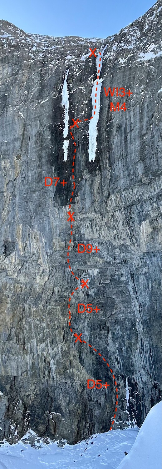 This is a very wild line that is likely to have niche appeal. If you enjoy both scrappy heads-up trad and overhanging technical climbing on bolts, then it’s a great adventure. It can also be a good fall-back if you reach the base of The Real Big Drip and find it out of condition.