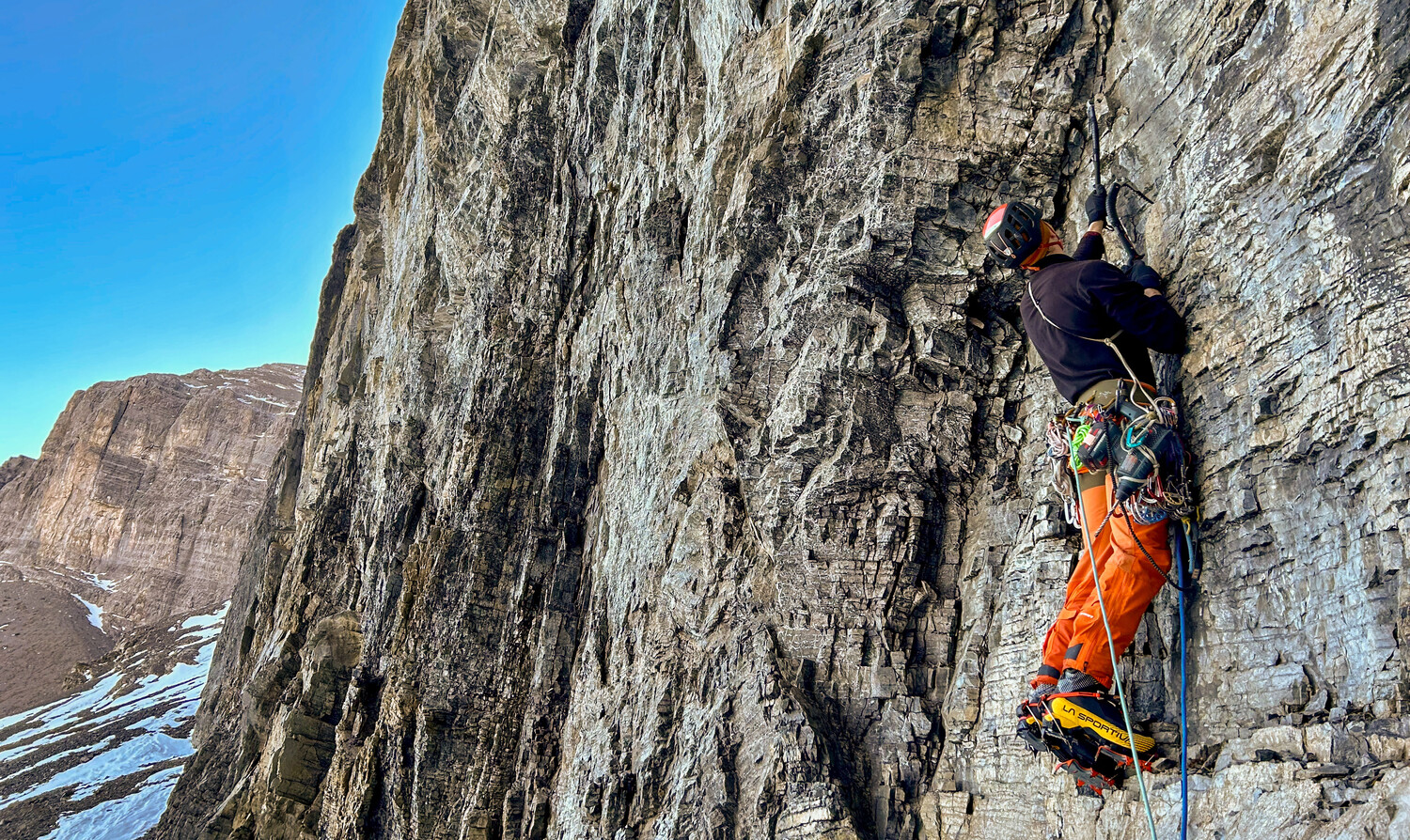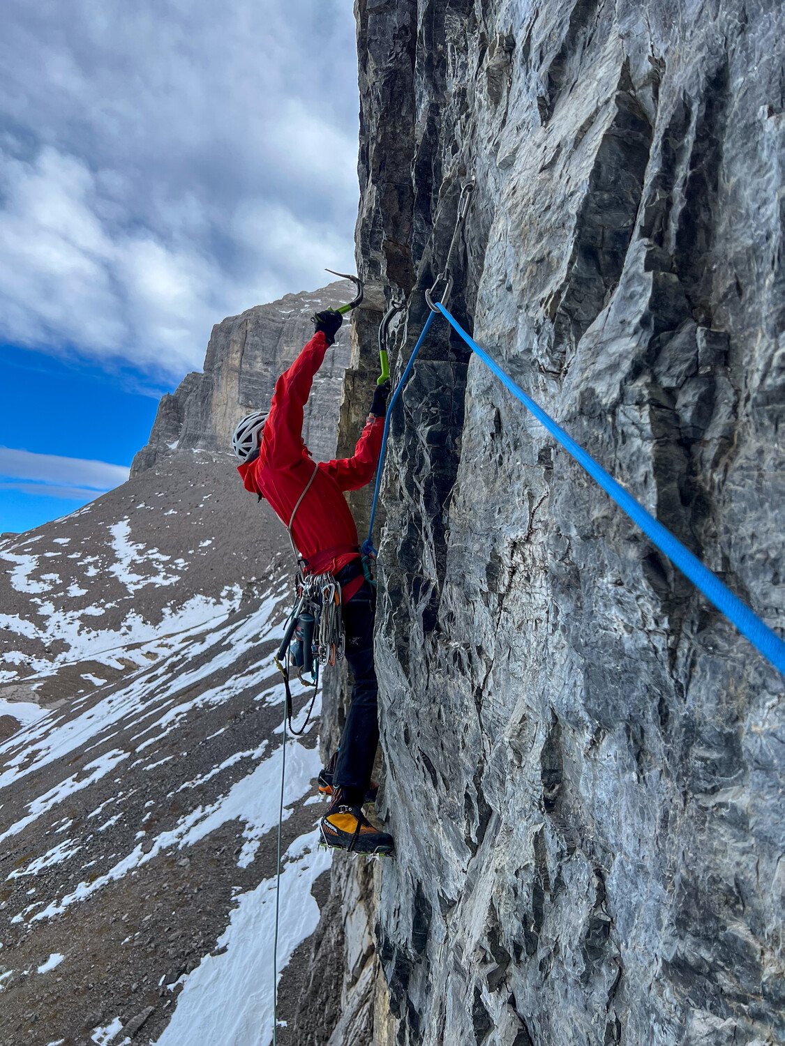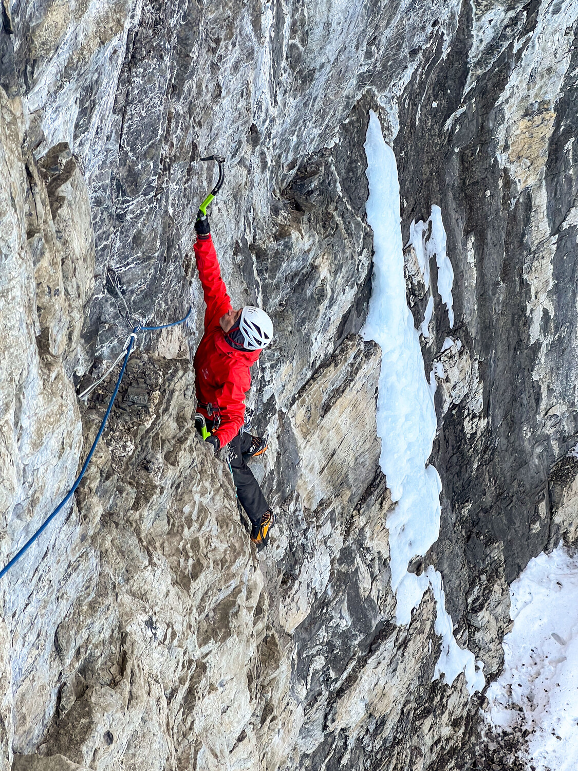 The day Raph bolted pitch 3 on lead was a bit of a revelation to me. I’d been establishing my own lines for a while at that point, but I did not realize how efficiently it could be done with good tactics and a bit of boldness. He bolted a pitch of M9 faster than I’ve worked my way through M6. He’d high-step off a bolt, and scratch around to find a single tooth tool placement to aid on. Fully committing to it, he’d drill another bolt, and the process would repeat. Writing about it now, it doesn’t sound crazy as it felt, but the vibe is very different when you’re dangling by the tip of your ice tool, with 70 meters of air beneath your feet.