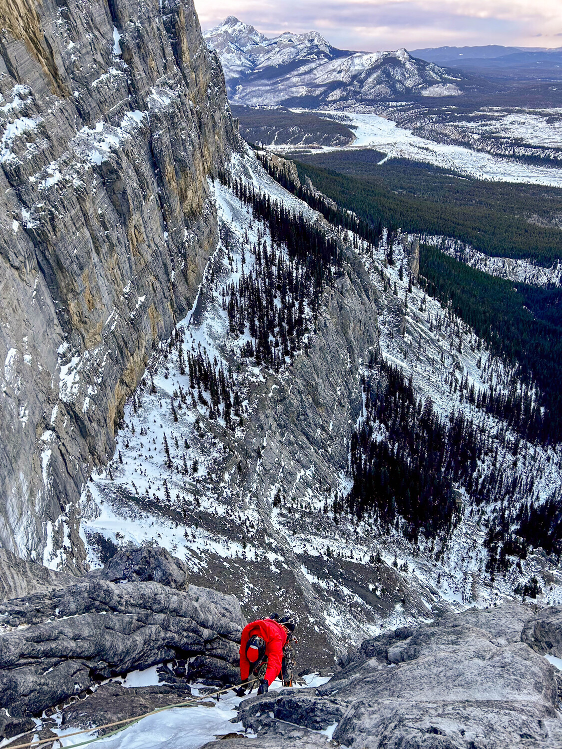 There are moments in our lives that will stick in our memories forever, and occasionally, you know it while you’re in them. I did a slow 60 meter fully free hanging rappel down toward the ground. A full moon shone into the cirque while thin clouds slid by. The Real Big Drip glowed in the moonlight beside me, its steady flow sounding like a peaceful fountain. The serene, snow covered Ghost River Wilderness extended out of the valley before me. The beam of Raph’s headlamp danced around far below. I savored the moment as I slowly spun in space.