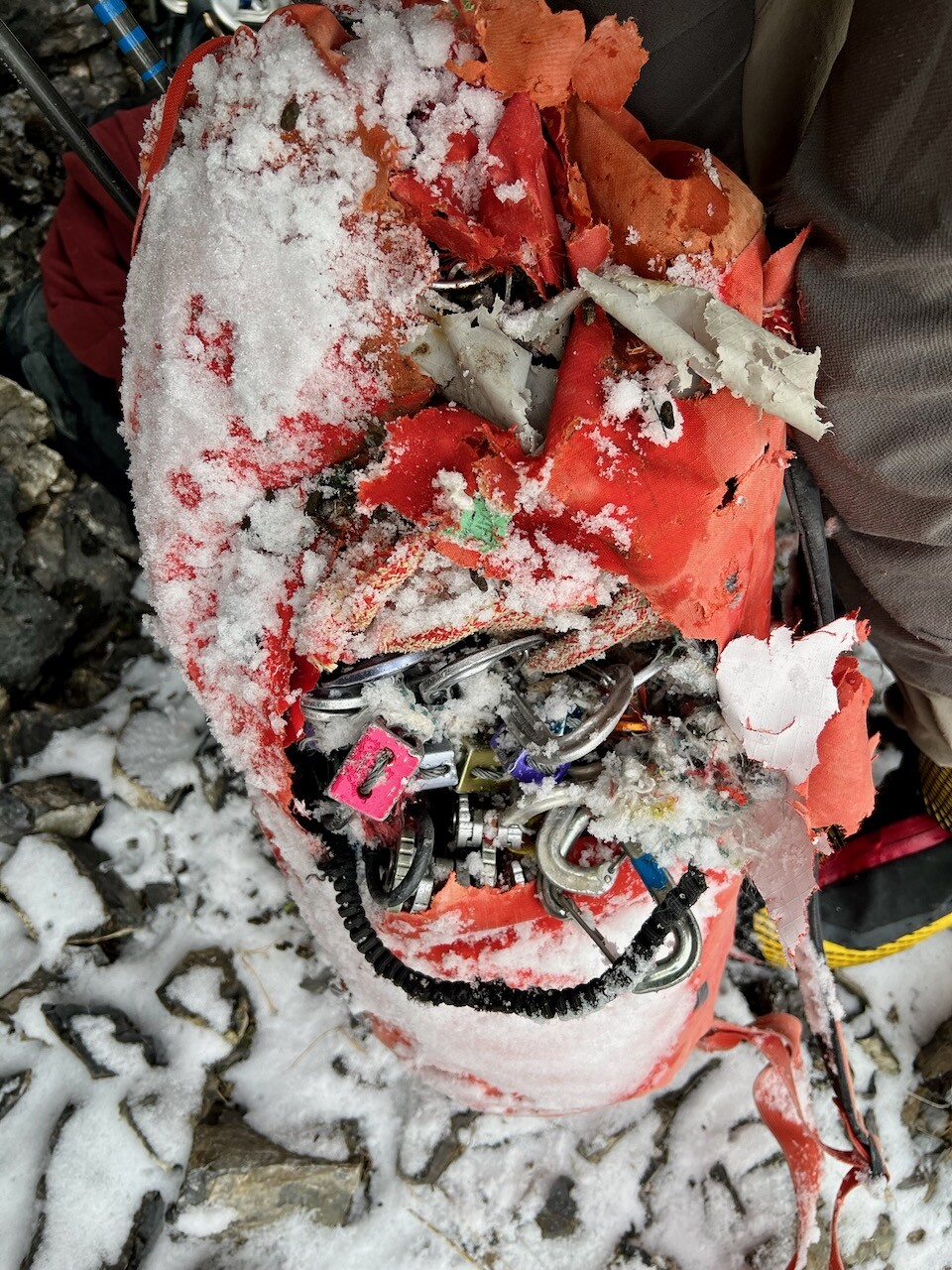 Pitch four was my project. I adopted similar tactics, combining free-climbing sequences with aid. It isn’t as steep of a pitch as the third, but it’s steep enough to be almost as airy. I found myself leaning back on a tool hammered into a dirty crack, with a series of questionable cam placements beneath me. I trusted it too much, leaning outward instead of putting my weight downward into the aid ladder. The tool ripped out from the slot without warning, and my weight came onto the tether attached to my lower tool. That tool ripped out too and plummeted into the snow below, but not before snapping it’s pommel in half. Eventually the rope came tight on a .5 cam, which slid down the crack and became fixed. It’s still there today.